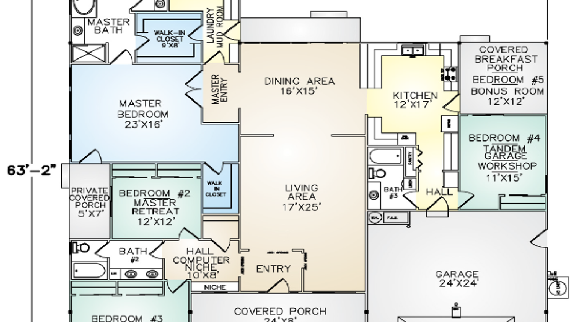 Personal choice and options top the list of features that the Astoria panelized kit home offers. Various rooms and areas can be modified to meet the homeowner’s personal desires and needs. The expansive master bedroom boasts two separate walk-in closets, a private covered porch, and an optional master retreat. The multi-use main laundry room can be accessed via the home, back porch, and master bedroom closet. Conveniently located in the front hallway is a computer desk niche and window. The spacious kitchen opens up into the dining area over a full-size counter. Through the kitchen door is a unique covered breakfast porch which can be modified for use as a bedroom, exercise or bonus room. Set apart from the main living area with access to a full bathroom is bedroom number four which can be modified to serve as a tandem garage, mini guest suite, work-out room, or workshop. The garage hallway has ample space for a stacking laundry unit, providing the home with two separate laundry facilities. With many unique features and room options the Astoria is a home that can meet and display the homeowner’s personal needs and style.