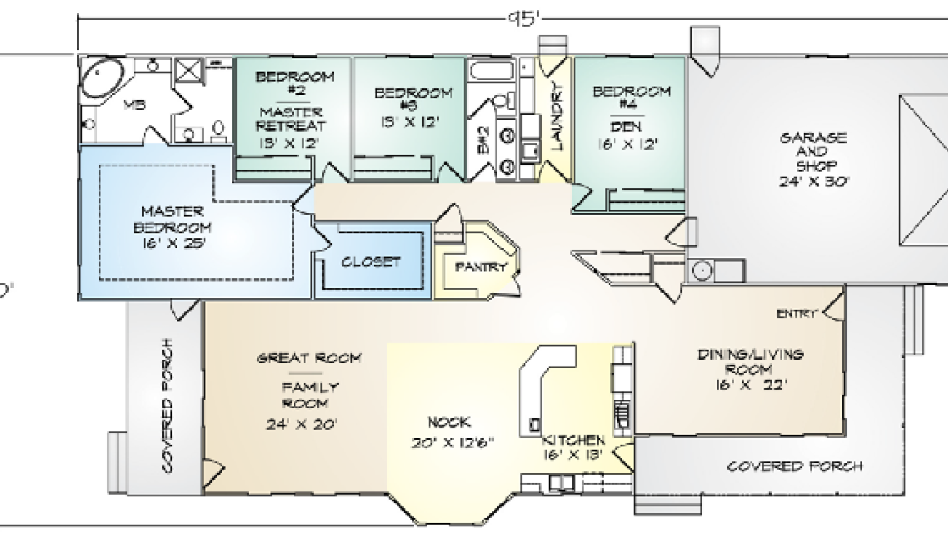 Especially designed for a deep lot, the Mendocino panelized kit home offers an attractive combination of space and convenience. The corner porch is easily accessed from the front and side yards as well as from the front and kitchen doors. Centrally located, the full-sized kitchen and nook feature a large walk-in pantry, breakfast bar, and island. Nine-foot ceilings accentuate the sheer size of the Mendocino. An extra-large laundry room enjoys both interior and exterior doors. The master suite has space for a desk, or media area, in addition to a large walk-in closet. Private access to the covered rear porch and a multi-use master bathroom featuring two separate rooms are additional highlights of this plan. Bedrooms three and four can be altered to serve as a den, master retreat, or joined to create a single, large bedroom. The two-car garage has an extra ten feet of depth that can be used for storage or a work bench, or it can easily be modified for use as a bonus room.