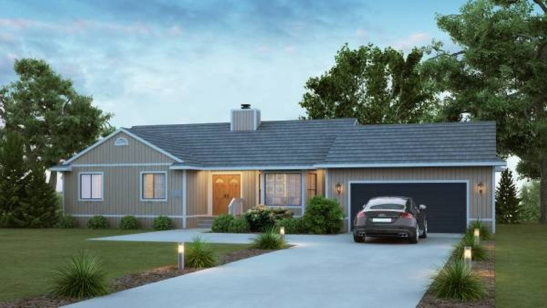 The Huntington panelized kit home offers a traditional ranch-style floor plan. This one-story home incorporates a formal entry with double doors and a formal dining room. The kitchen boasts convenient features such as an island with a second sink and easy access to both the formal dining room and breakfast nook. The master bedroom enjoys extra clothes storage areas such as a walk-in closet as well as a private bath.