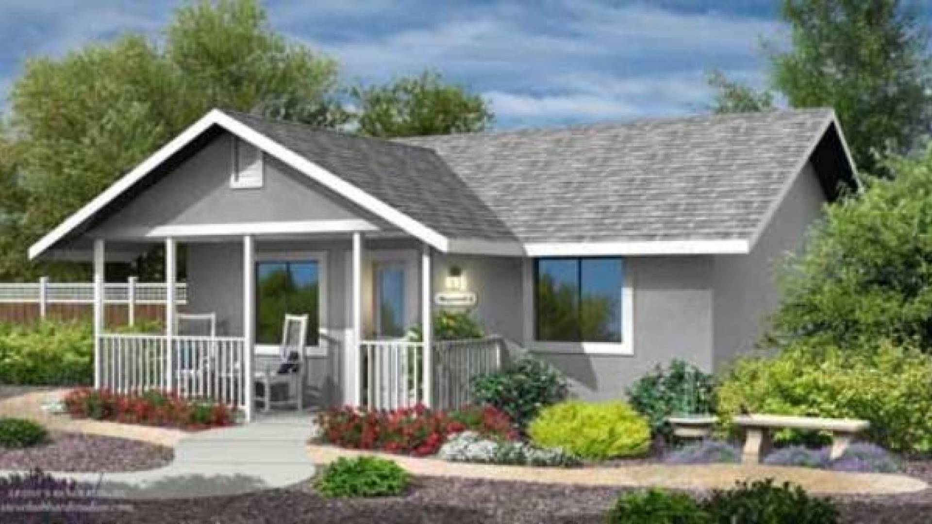 The Maywood panelized kit home offers a spacious 600 square foot living space. The front of the home boasts a generous, easily screened-in porch for sitting and enjoying the outdoors. The open-style living room and kitchen have vaulted ceilings that provide bonus space for storage cabinets above. The kitchen is full-sized and has a computer desk nook. The bedroom is illuminated by two windows and includes a six-foot wide closet. Within the spacious bathroom is a walk-in shower and a full-size laundry area. The Maywood panelized kit home is designed to meet the needs of aging-in-place with a step-less entry and 36" wide doors and hallways. With three exterior styles (lap siding, stucco, and panel siding) the Maywood can be finished to complement the lot's existing residence.