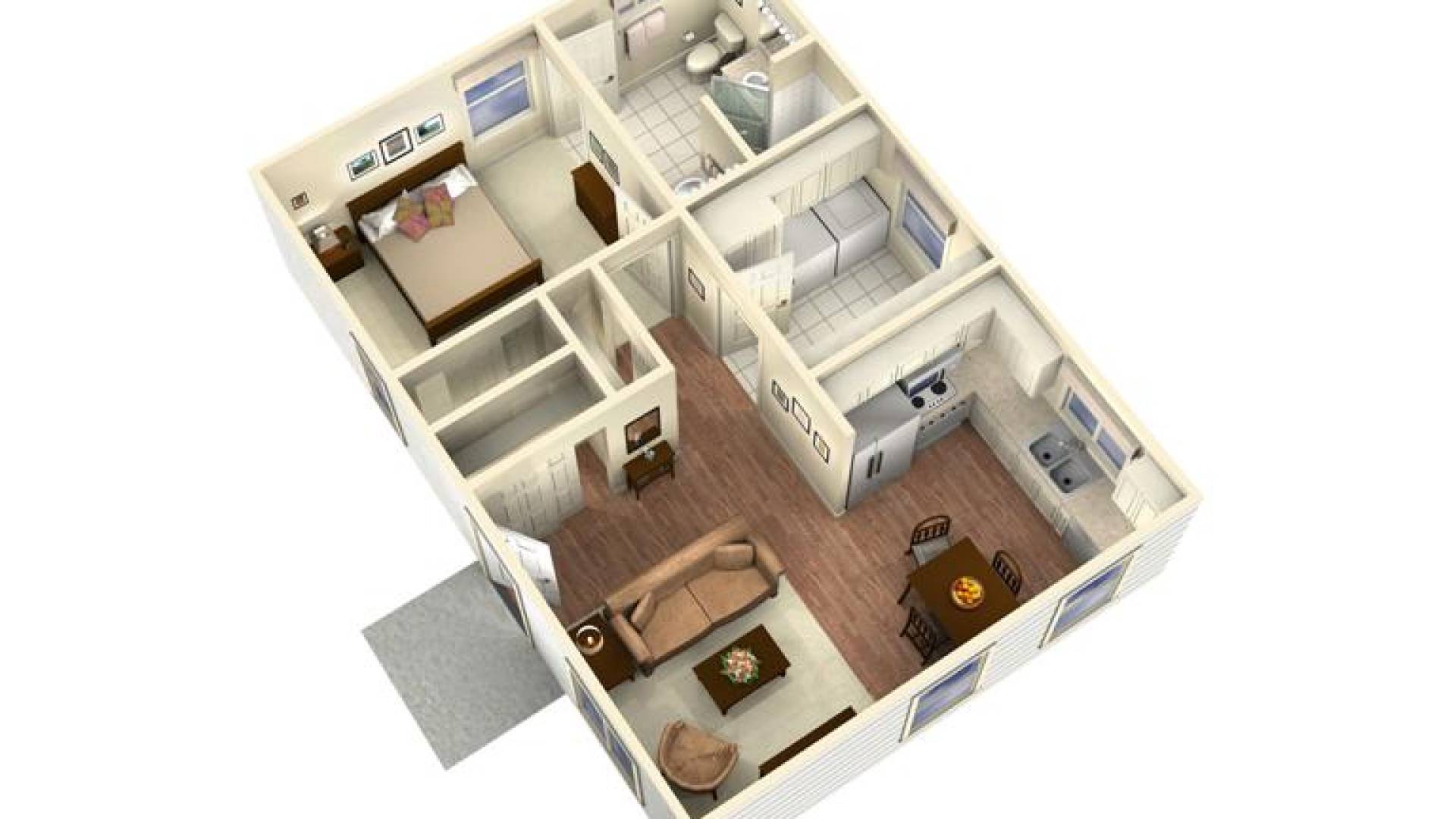 The Sonoma panelized kit home design features a welcoming Living/Dining area with vaulted ceilings and a spacious bathroom with two sinks and a walk-in shower. Other popular features include an expansive laundry room with wash tub, ample storage, and a utility closet. The Sonoma Plan provides extra living space on your existing property for family housing, home office, backyard retreat, or rental income.